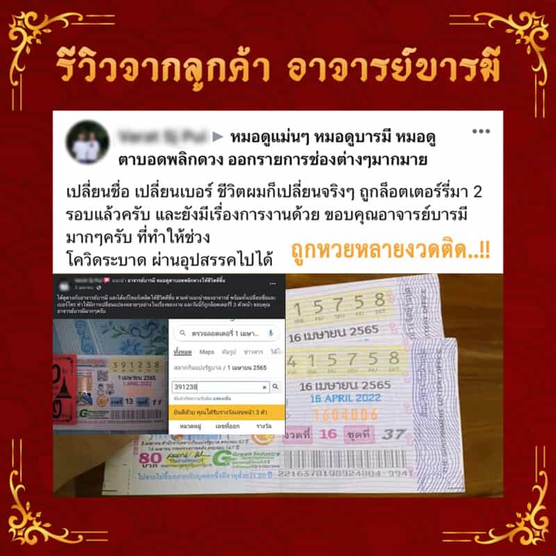 ได้เปลี่ยนทั้งชื่อ – นามสกุล กับอาจารย์บารมี ผ่านไปไม่ถึง 1 เดือน รู้สึกมีอำนาจ มีคนเคารพมีคนรักมากขึ้น ก็เลยไปหาอาจารย์บารมีอีกครั้ง ให้อาจารย์ช่วยแก้ไข เลขที่ร้านด้วยพร้อมอุปกรณฮวงจุ้ย ตอนนี้การค้าขายดีขึ้นมากจริงๆ ลูกค้าเข้ามาตลอด