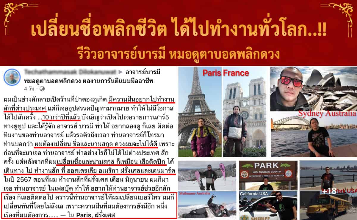 ทำงานอยู่ที่สิงคโปร์มา 2 ปีแล้ว มีเพื่อนที่สิงคโปร์ ได้เปลี่ยนชื่อกับอาจารย์บารมีแล้วดีมากค่ะ ก้าวหน้าในหน้าที่การงาน และมักมีโชคลาภเข้ามาเสมอดิฉันจึงสนใจ และได้โทรติดต่อมาหาอาจารย์ อาจารย์จึงทำนายชื่อ – นามสกุล และเปลี่ยนชื่อให้ใหม่ แต่ให้ใช้ นามสกุลเดิม และใช้แผ่นยันต์ครอบนามสกุลเอาไว้ขอบคุณอาจารย์มากๆค่ะ